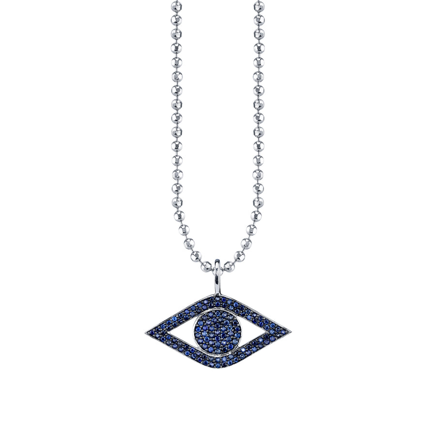 This 14k white gold and sapphire large protective eye charm necklace combines timeless elegance with powerful symbolism. Crafted from 14k white gold, the necklace features a bold protective eye charm, measuring approximately 5/8"H x 1 1/8"W, and adorned with sparkling sapphires to enhance its mystical allure. The protective eye is an ancient symbol believed to protect the wearer from negative energy and envy, offering a sense of spiritual defense and good fortune.