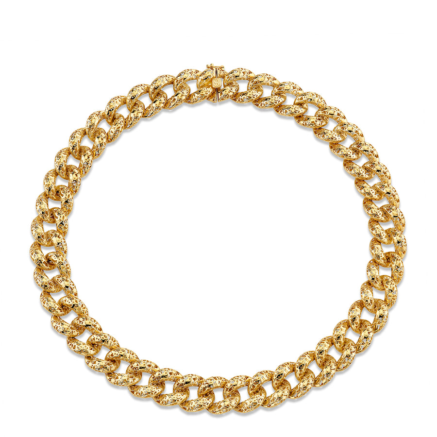 Elevate your everyday elegance with this exquisite 14k pure gold chain necklace, adorned with Sydney Evan's signature icon wallpaper pattern. Each delicate link showcases the brand's distinctive design aesthetic, creating a refined piece that seamlessly transitions from day to night. Crafted in lustrous 14k gold, this necklace offers timeless sophistication with a contemporary edge.