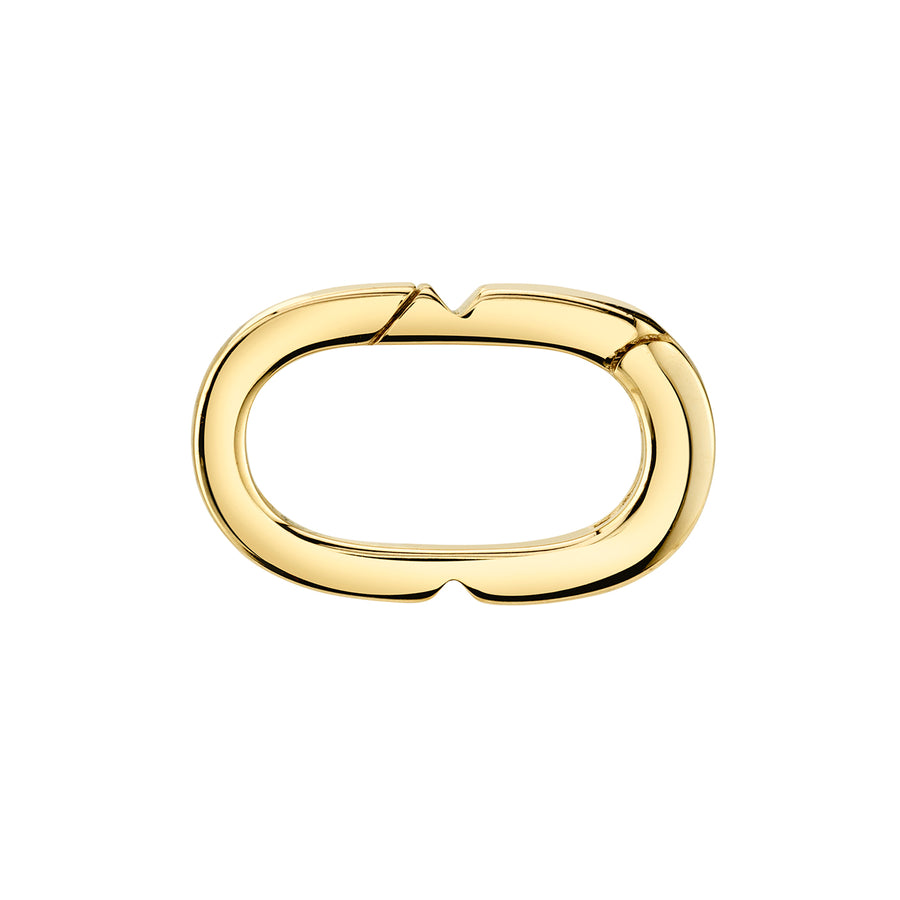 This sleek oval link clip is crafted in 14k yellow gold, measuring approximately 3/4" x 1/2" x 1/8". Its refined design adds a touch of elegance and versatility, perfect for securing charms or enhancing your favorite accessories.