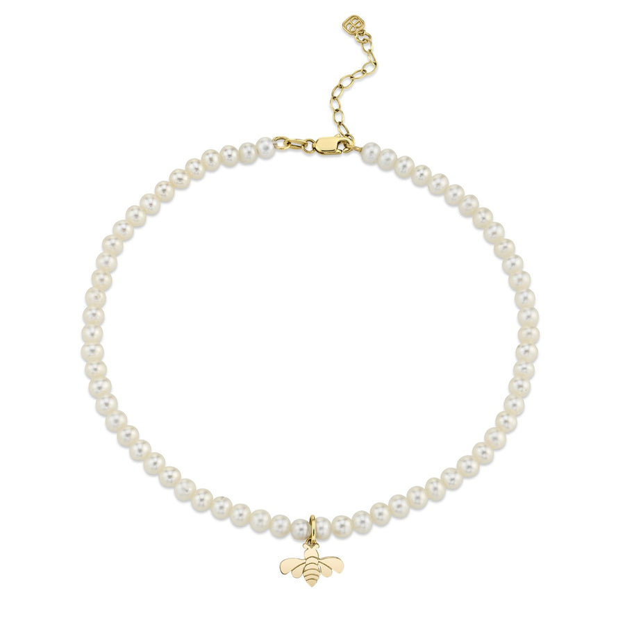 Pure Gold Tiny Bee Anklet on Fresh Water Pearls