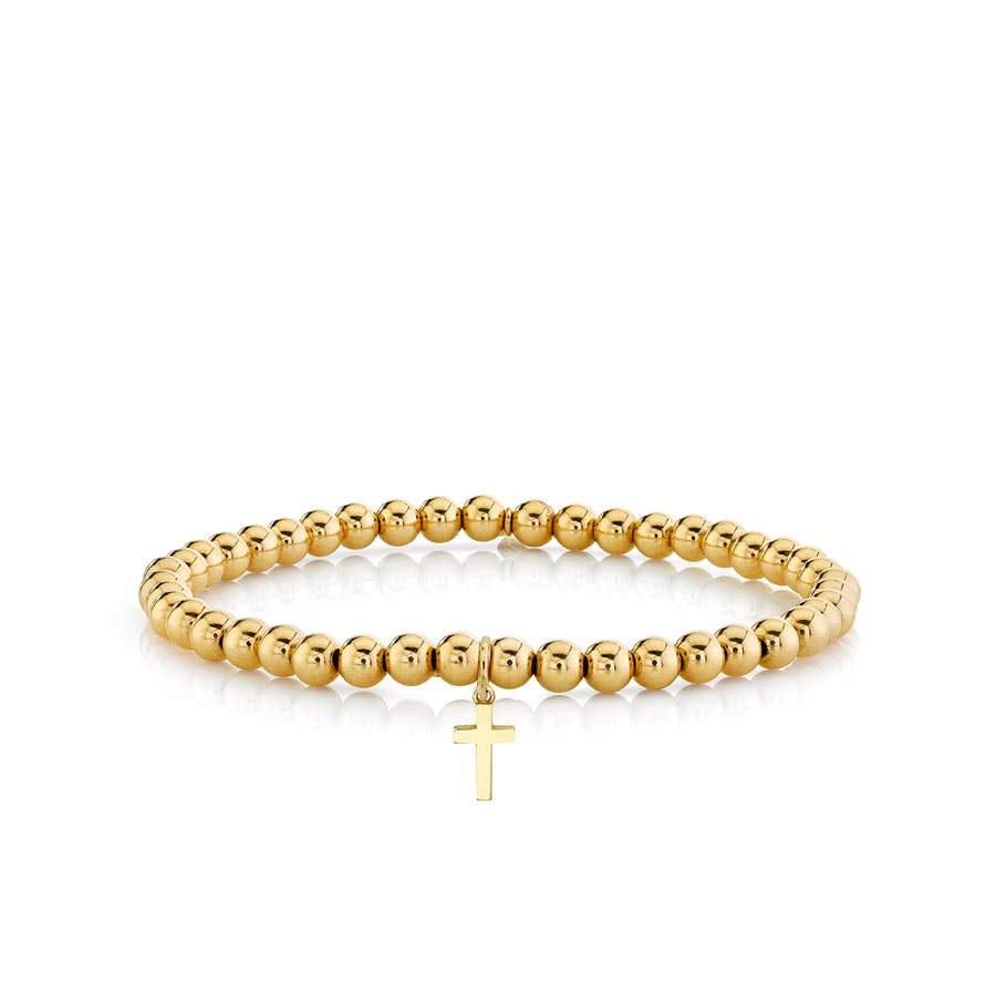 This delicate bracelet features a tiny cross charm in 14k yellow gold, symbolizing faith, protection, and spirituality, strung alongside 4mm 14k yellow gold beads for a refined, elegant touch. The simplicity of the design represents strength and the balance between spirituality and luxury. Each bracelet is strung on a stretch cord for comfort and flexibility, and is adorned with the signature 14k gold SE logo charm, a mark of timeless craftsmanship. The standard size is approximately 6.25", with custom sizing available upon request to ensure a perfect fit for you. Reach out for personalized adjustments to make this piece uniquely yours.