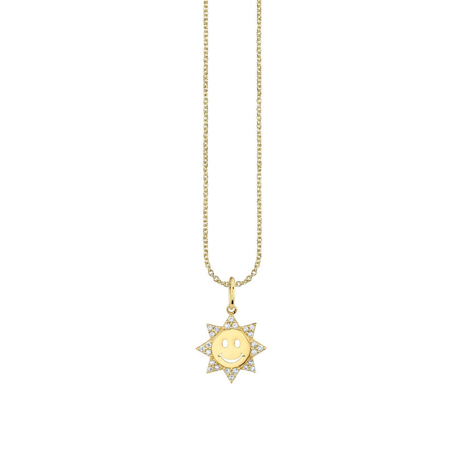 Radiating warmth, optimism, and a playful spirit, this 14k yellow gold happy face sun charm necklace is a cheerful reminder to carry sunshine wherever you go. The small charm is intricately crafted in gold and adorned with sparkling pavé-set diamonds, capturing the essence of joy and light in a single, smile-worthy symbol.