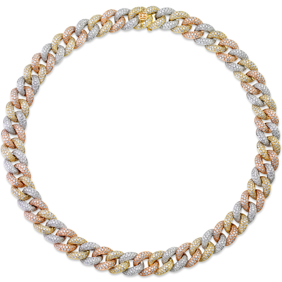 This elegant 14k white, rose, and yellow gold link necklace features meticulously pavé-set diamonds in every link, creating a dazzling interplay of light and color. The 14k gold in white, rose, and yellow symbolizes unity and balance, combining timeless beauty with a touch of romance and warmth. Each link, measuring approximately 1/2" x 1/2", is thoughtfully crafted to ensure the diamonds sparkle from every angle, while the necklace's 16" length rests gracefully around the neck, adding an exquisite finishing touch to any ensemble. Available by special order only, this piece is a true statement of refined luxury, offering a personalized touch that reflects individual style and elegance.