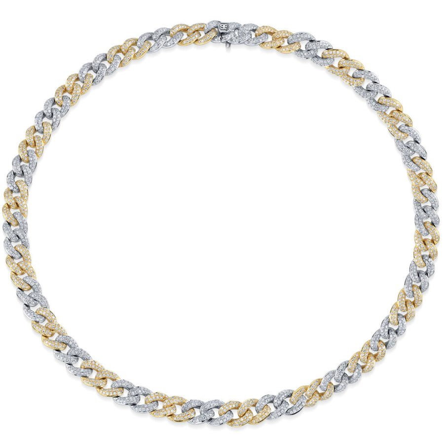 This elegant 14k two-tone gold necklace features delicate small links, each adorned with pavé-set diamonds that add a brilliant sparkle. The design symbolizes the beauty of unity and connection, with each link interwoven to create a seamless flow. The diamonds, carefully set within every link, represent enduring love and the light that shines through even the smallest moments. Measuring approximately 1/3" x 3/8" per link, the necklace offers a timeless, sophisticated look at 16" in length, perfect for layering or wearing alone. Available exclusively by special order, this piece is a true reflection of craftsmanship and elegance.