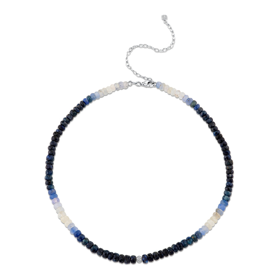 Crafted from 14k white gold, the necklace features a beautiful diamond ball charm that adds a touch of elegance and sparkle. The charm is strung on a necklace of 5mm shaded sapphire faceted beads, creating a unique and eye-catching design.