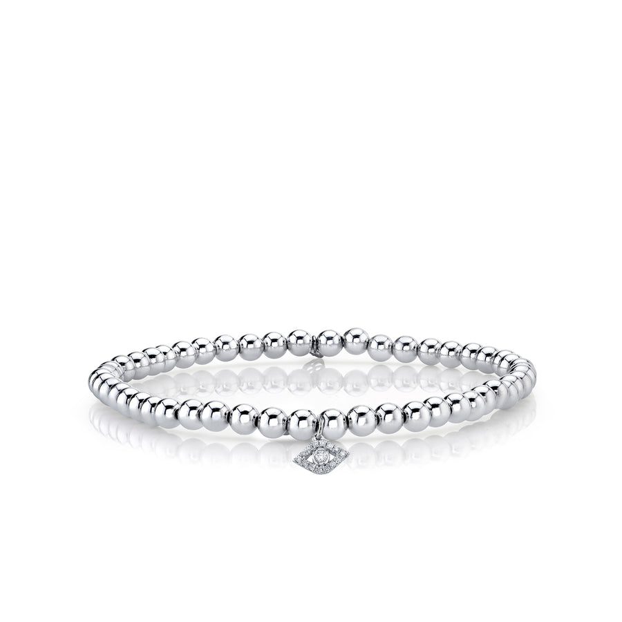 Embrace timeless protection and elegance with this 14k Gold and Diamond Eye Charm Bracelet. The delicate protective eye charm, crafted in 14k gold and adorned with sparkling diamonds, symbolizes protection, wisdom, and good fortune—an ancient talisman believed to ward off negative energy. It is paired with 4mm 14k white gold beads, creating a harmonious blend of luxury and spiritual significance.