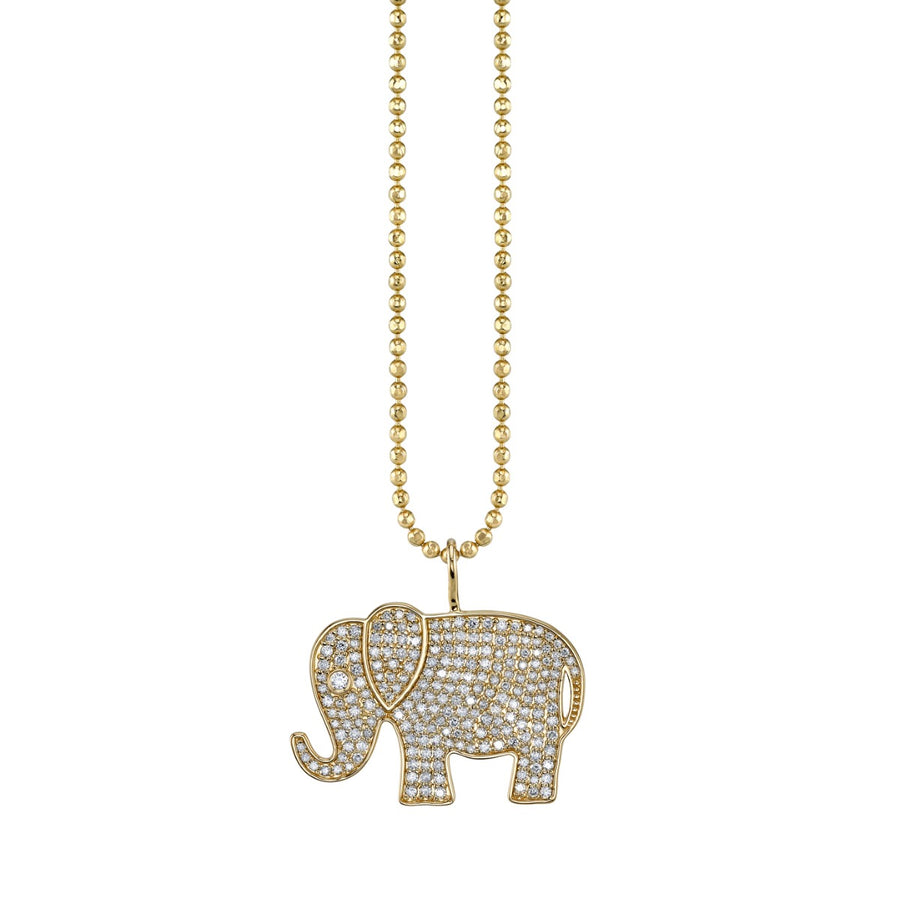 This stunning large 14k yellow gold elephant charm is a symbol of strength, wisdom, and good fortune, making it a meaningful and elegant addition to any jewelry collection. Expertly crafted with pavé-set diamonds, the charm gleams with timeless brilliance and exquisite detail. The charm itself measures approximately 3/5" in height and 1" in width, offering a bold yet graceful presence. Suspended from a fine 14k gold heavy ball chain, which is approximately 18" in length, this piece combines luxury with durability for an unforgettable look. Perfect for those who appreciate fine craftsmanship and the deeper significance of symbols, this elephant charm is sure to become a treasured keepsake.