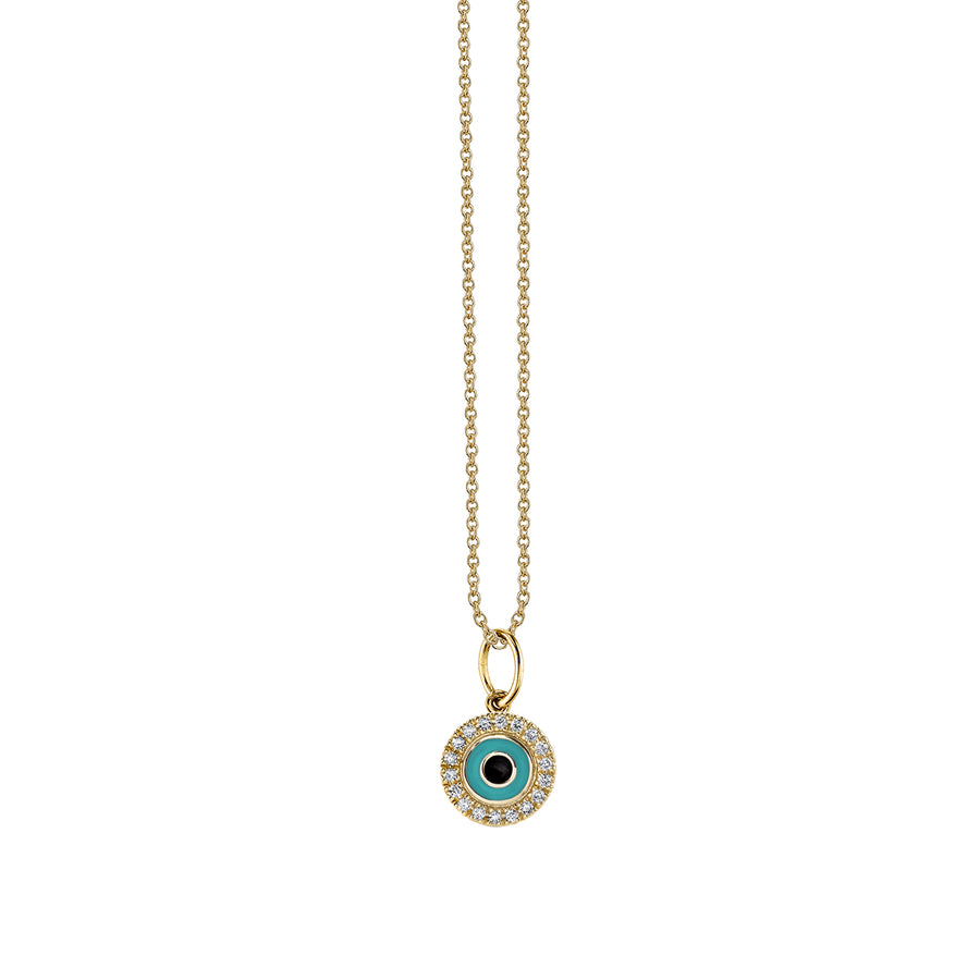 Channel protection and style with our 14k Yellow Gold Round Protective Eye Charm Necklace, featuring a striking enamel center in your choice of turquoise or white, beautifully framed by pavé-set diamonds. The charm measures approximately ¼" in diameter, offering a delicate yet captivating focal point.