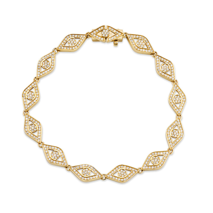This 14k yellow gold and diamond protective eye charm link bracelet combines timeless elegance with meaningful symbolism. The protective eye, a symbol of protection and good fortune, is carefully crafted in shimmering 14k yellow gold, adorned with sparkling diamonds to enhance its power and beauty. The bracelet, measuring 6 3/4" in length, is designed to fit comfortably and can be worn daily or for special occasions. Whether as a protective talisman or a fashionable accessory, this bracelet serves as a reminder of positivity and warding off negativity, making it a meaningful and stylish addition to any collection.