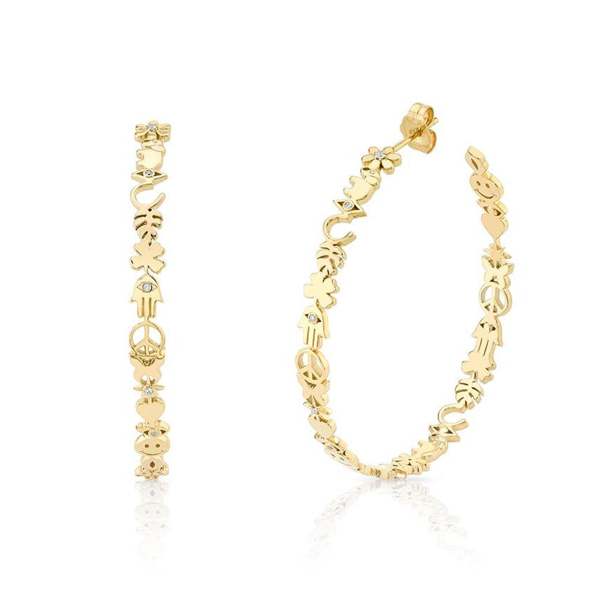 These stunning 14k yellow gold and diamond large icon hoops showcase Sydney Evan's signature symbols, each thoughtfully crafted to carry a deeper meaning. The hoops, measuring approximately 1 3/4" x 1 3/4", evoke a sense of timeless elegance and personal significance. The combination of lustrous gold and sparkling diamonds reflects strength and beauty, while the carefully selected iconic symbols add layers of storytelling and empowerment. Whether worn as a statement piece or an everyday symbol of love, protection, or luck, these earrings are a true representation of both style and substance.