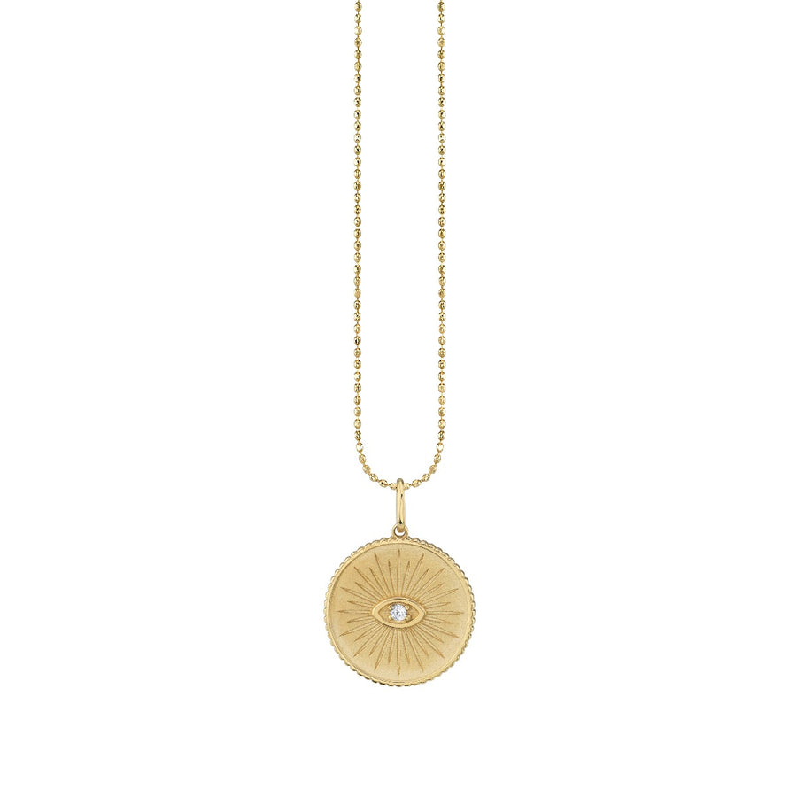A symbol of clarity, protection, and timeless style, this 14k yellow gold marquis eye coin necklace is a modern heirloom with ancient roots. The coin pendant, measuring approximately 1/2" x 1/2", features a central round white diamond set within a refined marquis-shaped eye—a universal emblem of intuition and spiritual safeguarding.