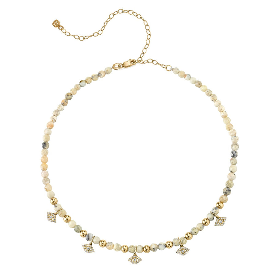 Embrace protection and natural beauty with this stunning 14k yellow gold charm necklace, featuring five bezel-set diamond protective eye pendants delicately spaced along a strand of 4mm African opal and 14k yellow gold beads. Each protective eye charm measures approximately 1/8" x 1/4", symbolizing vigilance and warding off negative energy. The necklace measures 18 inches in length, offering a vibrant and versatile accessory with unique bead colors and shapes that may vary naturally.