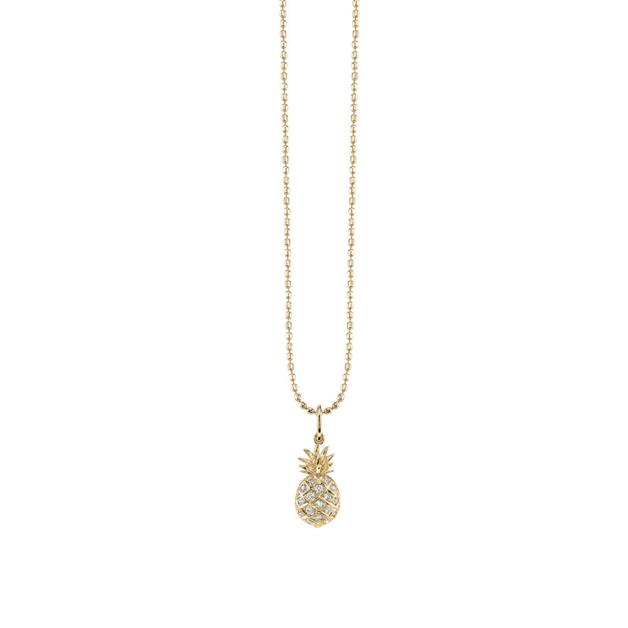 Add a touch of tropical elegance to your jewelry collection with this delightful 14k yellow gold pineapple charm necklace, beautifully accented with sparkling pavé diamonds. The charming pineapple pendant symbolizes warmth and hospitality, making it a meaningful and stylish accessory. The fine 14k gold ball chain is available in 16" or 18" lengths for versatile wear.