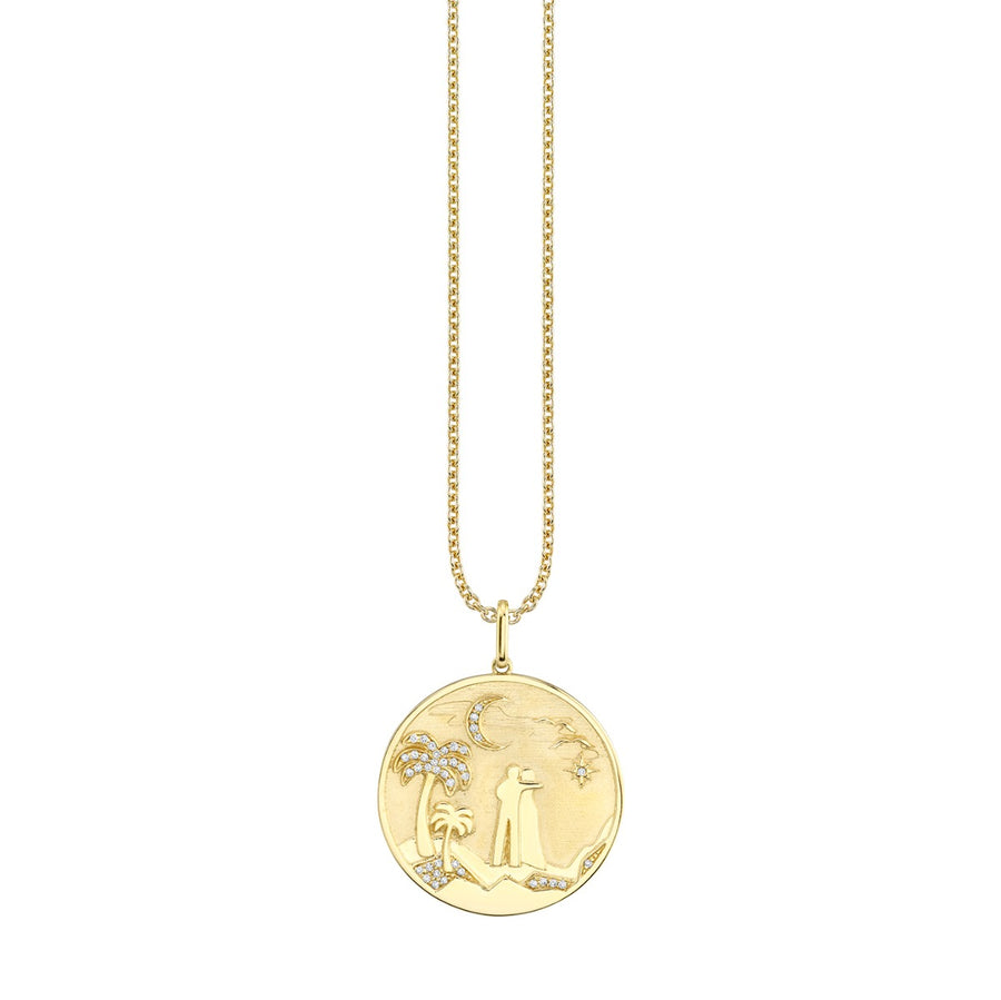 A tribute to golden horizons and new beginnings, this 14k yellow gold sunset coin necklace captures the poetic beauty of day’s end and the promise of renewal. The generously sized 1" x 1" coin pendant is richly detailed with a radiant sunset motif accented by pavé-set diamonds, evoking warmth, light, and the quiet power of transformation.