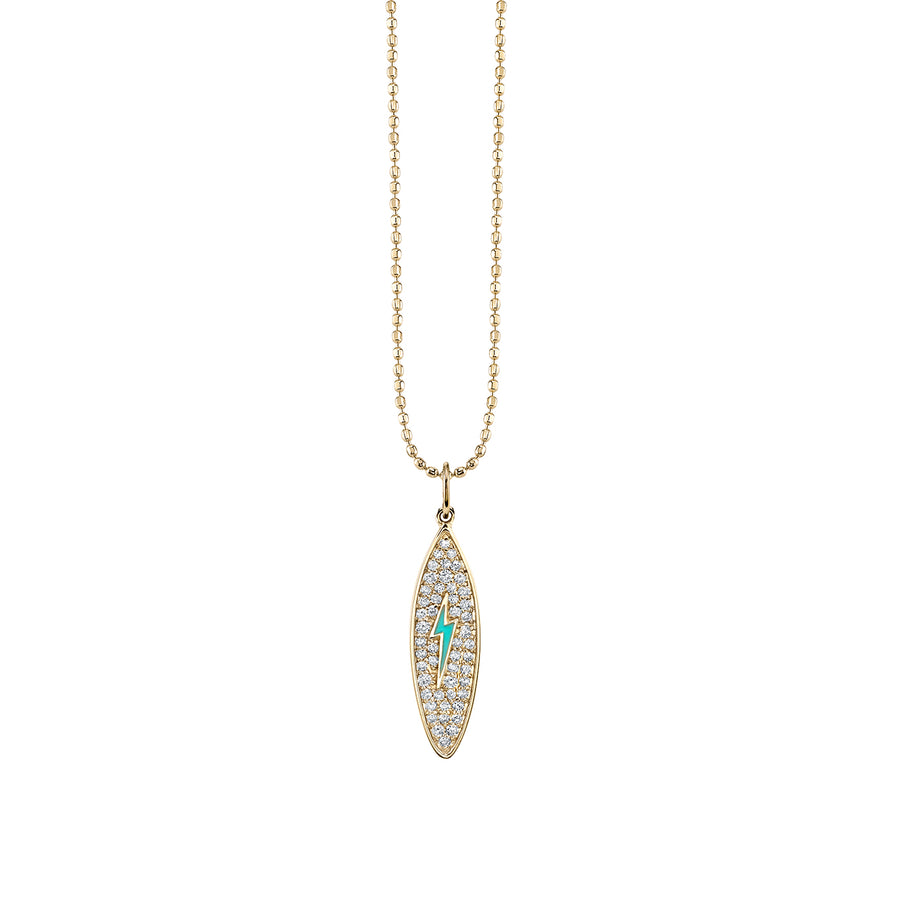 This stunning 14k yellow gold and pavé diamond surfboard charm is a perfect blend of elegance and adventure. The delicate charm features a turquoise enamel lightning bolt icon, symbolizing both the power and energy of the ocean as well as the thrill of chasing the perfect wave. The surfboard, crafted in fine 14k gold, measures approximately 3/4" x 1/4", creating a sleek yet bold statement. The pavé diamonds add a touch of sparkle, reflecting the sunlight on the water's surface. This pendant is paired with a fine 14k gold ball chain, available in 16" or 18" lengths, offering versatile styling options. Whether you’re a beach lover or a seeker of energy and vitality, this piece brings both style and meaningful symbolism to your collection.