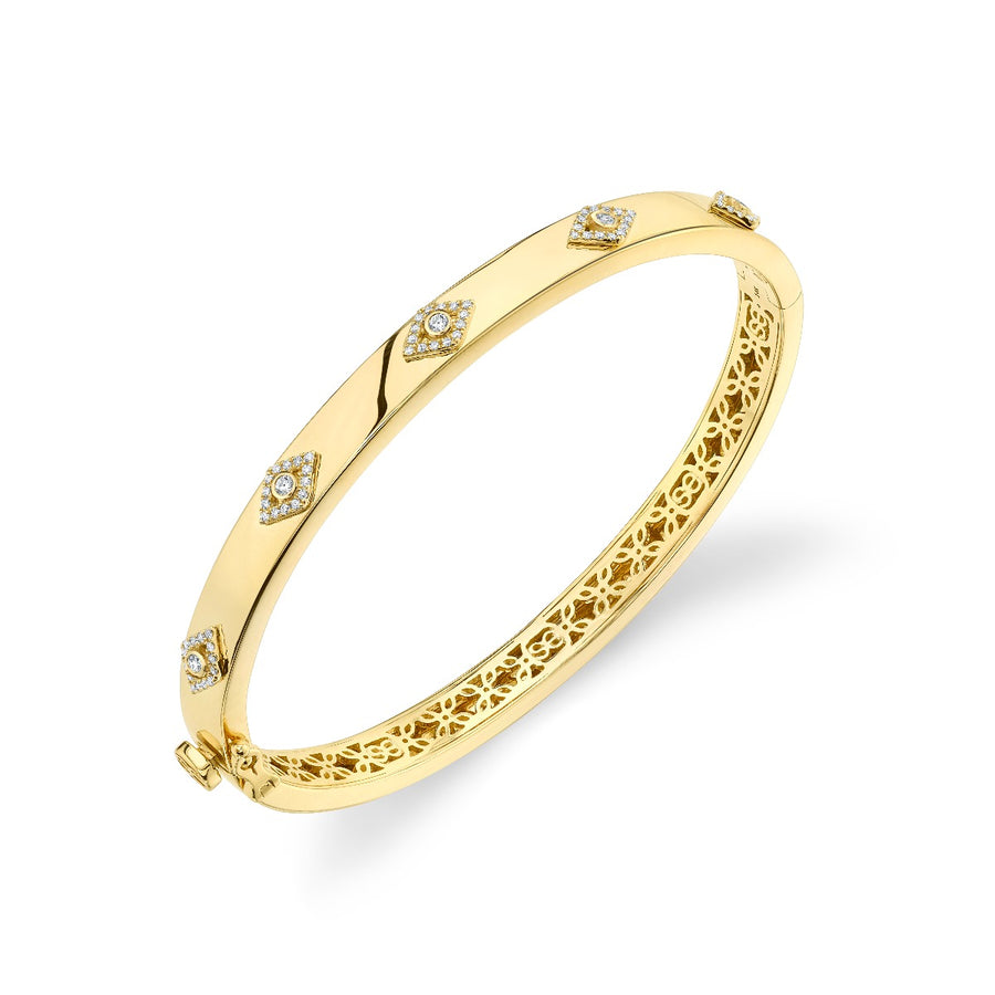 This stunning 14k yellow gold and diamond multi eye bangle is a powerful blend of elegance and protection. The design features multiple delicate protective eye symbols, each adorned with sparkling diamonds to enhance the sense of security and ward off negative energy. The protective eye, a symbol of spiritual protection, is believed to bring good fortune and shield the wearer from harm. Crafted in high-quality 14k yellow gold, this bangle is available in sizes 6", 6.25", and 6.5", with approximate dimensions of 1/4" height and 2 1/2" width. A perfect balance of luxury and symbolism, it’s a timeless piece for those who seek both beauty and empowerment in their jewelry.