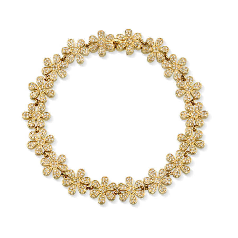 This 14k yellow gold daisy eternity bracelet symbolizes enduring beauty and the circle of life, with each delicate daisy representing purity, growth, and the eternal bond of nature. The pavé set diamonds glisten like drops of morning dew, adding a touch of timeless elegance and sparkle to the design. Measuring approximately 6.75" in length, this bracelet is a perfect expression of sophistication and unity, with the continuous loop of daisy petals embodying the infinite love and connection between moments and memories.