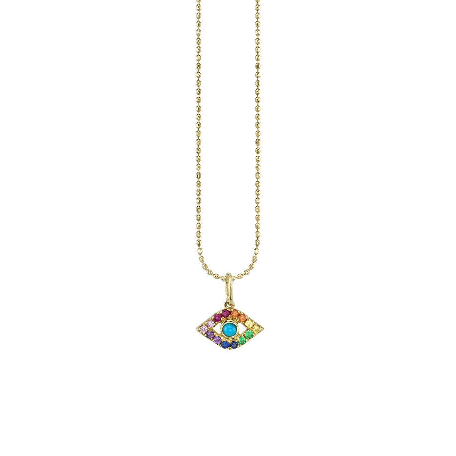 Vibrant and symbolic, this 14k yellow gold protective eye charm necklace is a radiant talisman of protection and positivity. The eye—an ancient symbol believed to ward off negative energy—is reimagined with a bold turquoise center surrounded by a bezel of rainbow-hued gemstones, celebrating color, balance, and spiritual clarity.