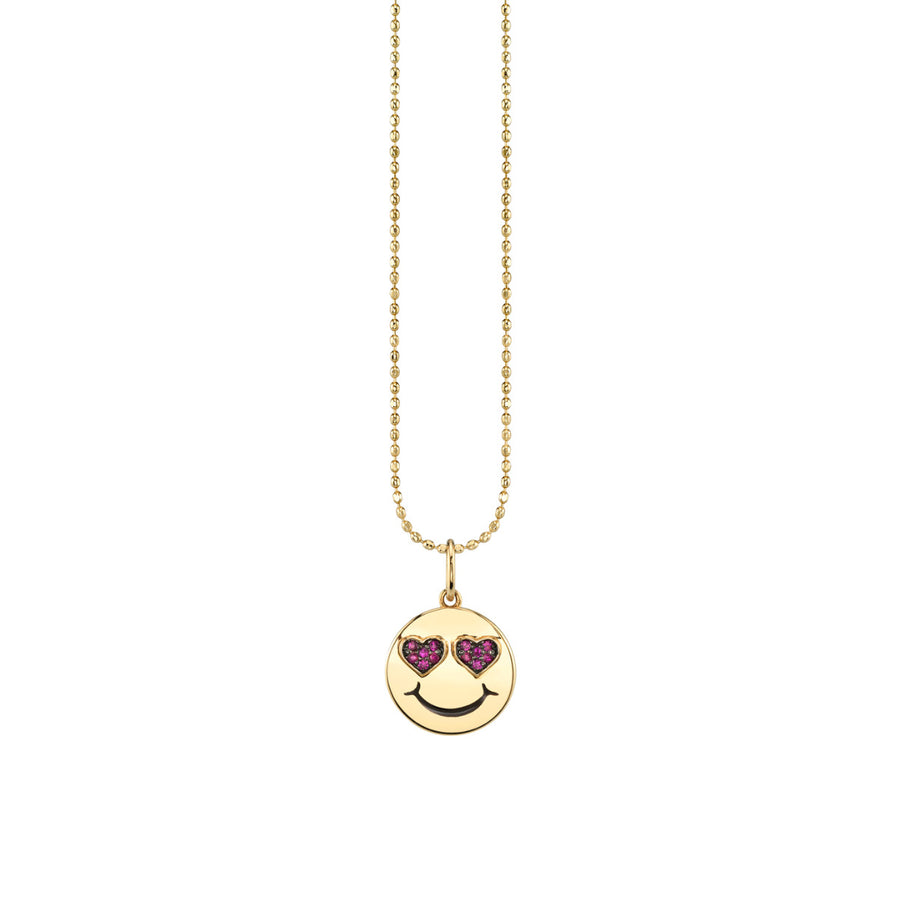 Spread joy and love with this adorable 14k yellow gold happy face charm necklace, featuring a playful heart eyes design. The charm measures approximately ½ inch by ¼ inch and hangs delicately from a fine 14k gold ball chain available in 16" or 18" lengths. This necklace is a fun and meaningful way to brighten any outfit.